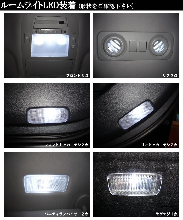 12点セット ・フロントルームランプ 3個 ・リアルームランプ 2個 ・ラゲッジルームランプ 1個 ・ドアカーテシルームランプ 4個 ・バニティーミラーランプ 2個 ※レンズ類は付属致しません。