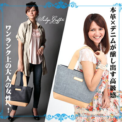代引不可 INDIGOGRAFFITI(インディゴグラフィティ)AQAVOID LINE INO(アクアボイド ライン イーノ)本革トートバッグ レディースバッグ 牛革デニムバッグ