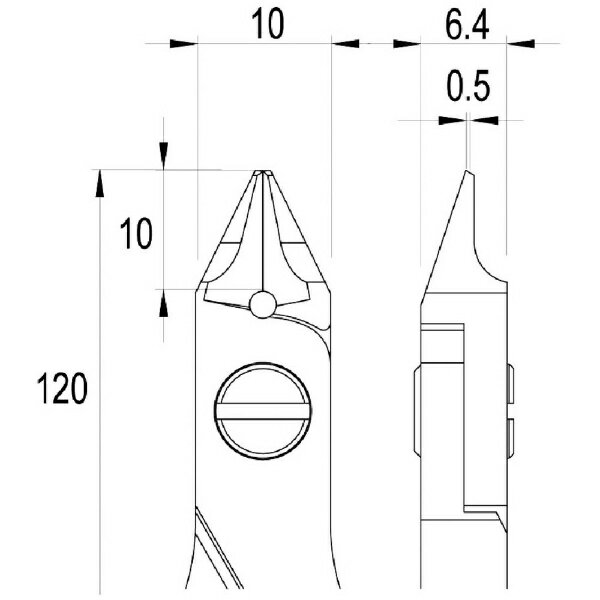 仕様■全長(mm): 120■刃表面形状: フルフラッシュ刃■刃先(mm): 10.0■切断能力(mm)硬線: -■切断能力(mm)中硬線: φ0.1〜0.4■切断能力(mm)軟線: φ0.1〜0.8■タイプ: 先細リリーブ形材質/仕上げ■刃部: 高炭素クロム低合金鋼■グリップ: 熱可塑性エラストマー(TPE)、ポリプロピレン(PP)