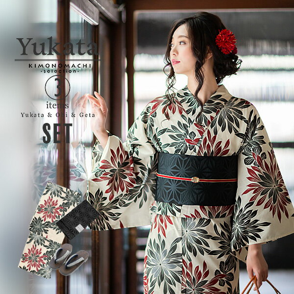 浴衣 セット レディース 大人 浴衣セット 浴衣3点セット(浴衣+帯+下駄) 「菊 赤と黒+半幅帯ブラック」 花火大会 夏祭り 女性用 女性浴衣 ゆかた 【メール便不可】