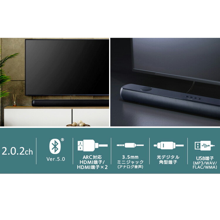 ●商品サイズ(cm)幅約96×奥行約11.3×高さ約8.15●本体質量約3.5kg●電源AC 100V 50/60Hz●消費電力32W●待機時消費電力1.0W以下●最大出力30W×2+20W×2●形式密閉型●再生周波数帯域70Hz〜20kHz●入力HDMI:HDMI端子×2、HDMI端子(ARC対応)×1OPTICAL:光デジタル角型端子(PCMのみ)AUX:3.5mmミニジャック(アナログ音声)Bluetooth:Bluetooth 5.0USB:対応フォーマット(MP3、WAV、FLAC、WMA)●使用環境温度:5〜35℃湿度:20〜80%●付属品電源コード×1、ステレオ音声ケーブル×1(3.5mmミニプラグ)、HDMIケーブル×1、リモコン×1【Bluetooth部】バージョン:Bluetooth Ver.5.0最大通信出力:5dBm以下通信周波数帯域:2402〜2480MHz対応プロファイル:A2DP、AVCTP、AVDTP、GAVDP、AVRCP、IOPT【リモコン】使用電池:単4形乾電池×2※本機は日本国内専用です。